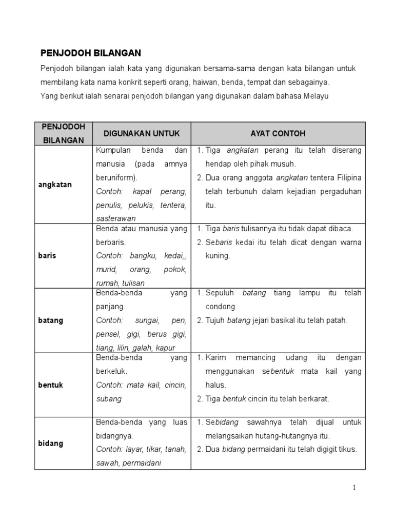 Penjodoh Bilangan Bahasa Melayu 2. Penjodoh bilangan ialah kata yang digunakan bersama-sama dengan kata bilangan untuk membilang kata nama konkrit seperti orang haiwan benda tempat dan sebagainya. Senarai penjodoh bilangan penggunaannya dan.